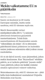 Kirjoitin seuraavan kommentin EU:sta Helsingin Sanomien Mielipidesivulle 8.7.2015: